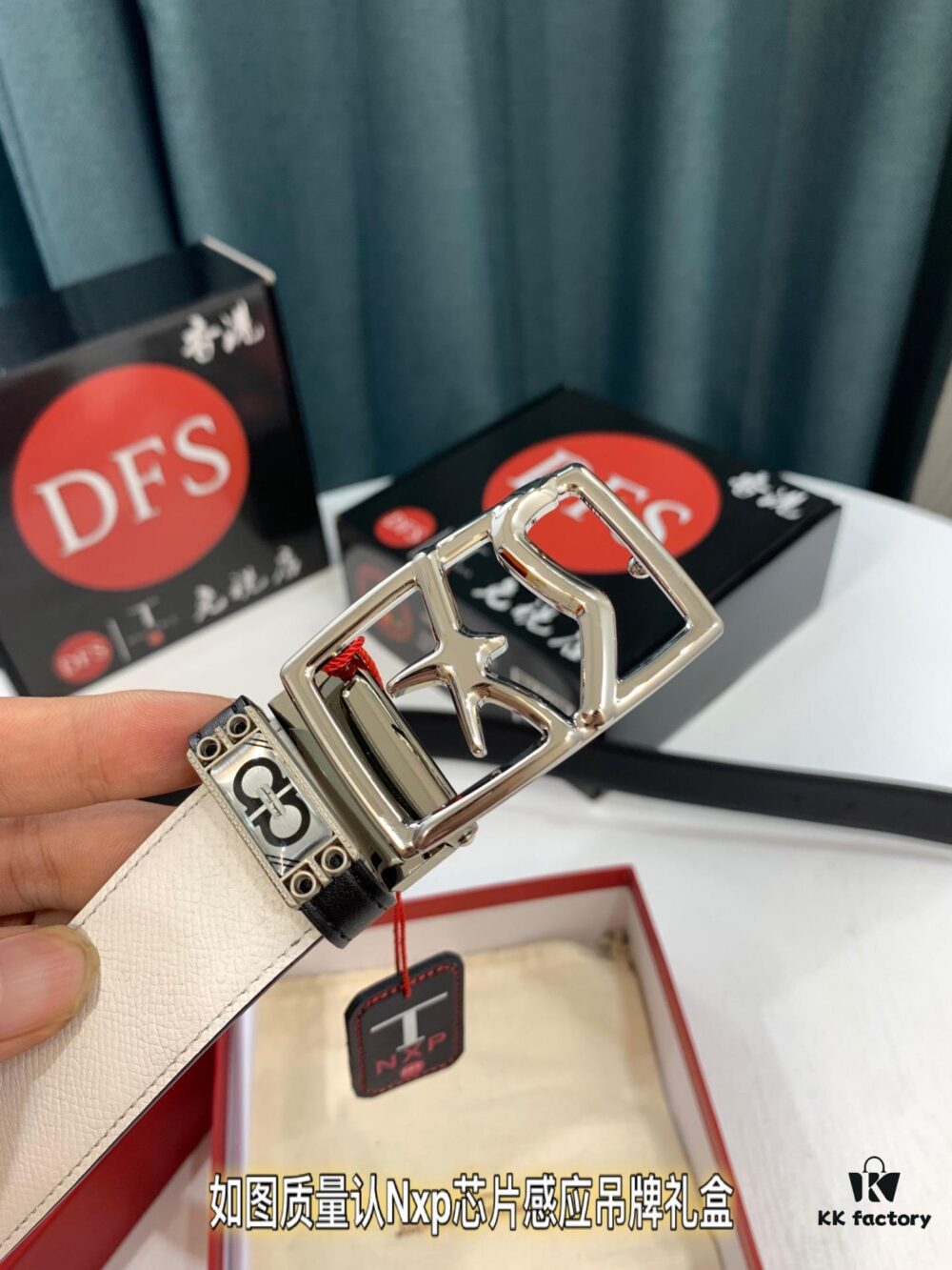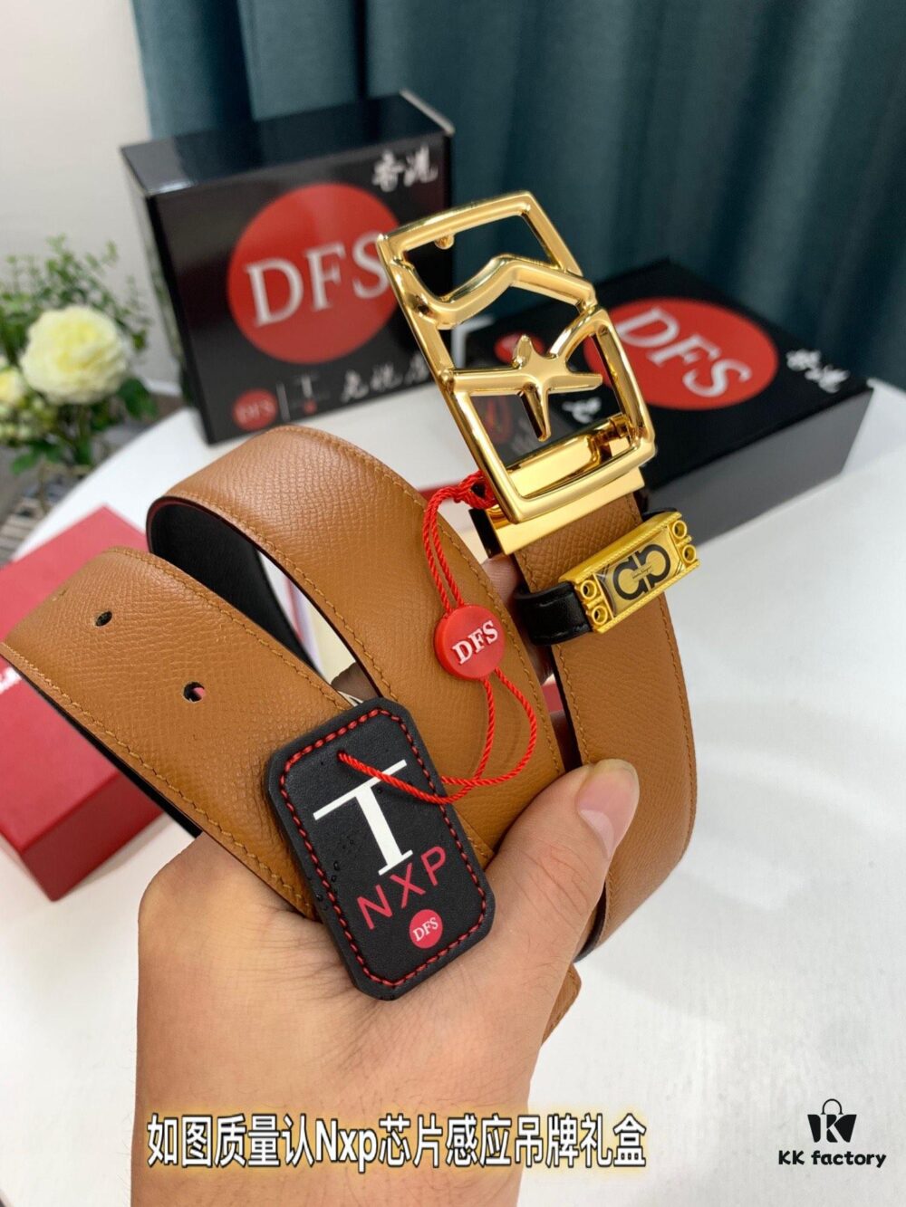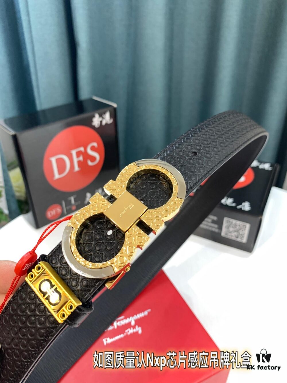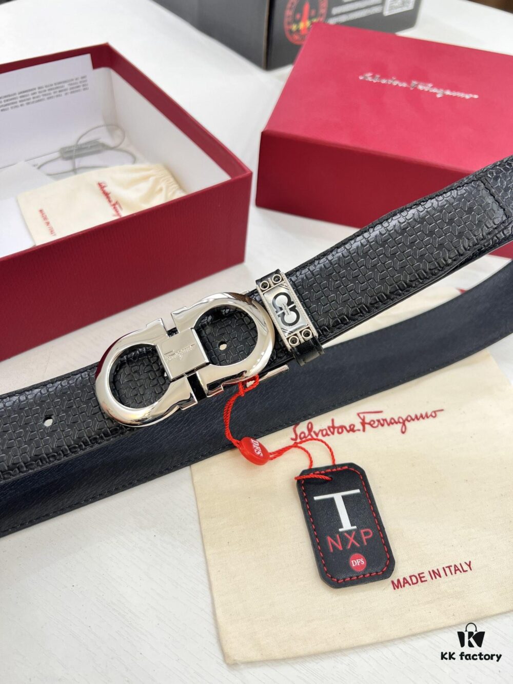 Ferragamo Men’s Belt, Genuine First-Layer Calfskin, Double-Sided Wear, Rustic Bark Texture, 3.5cm Width, New ‘8’ Shaped Stainless Steel Buckle, Real Item Photography