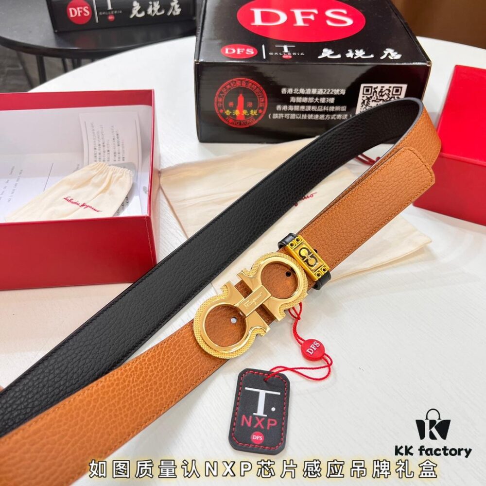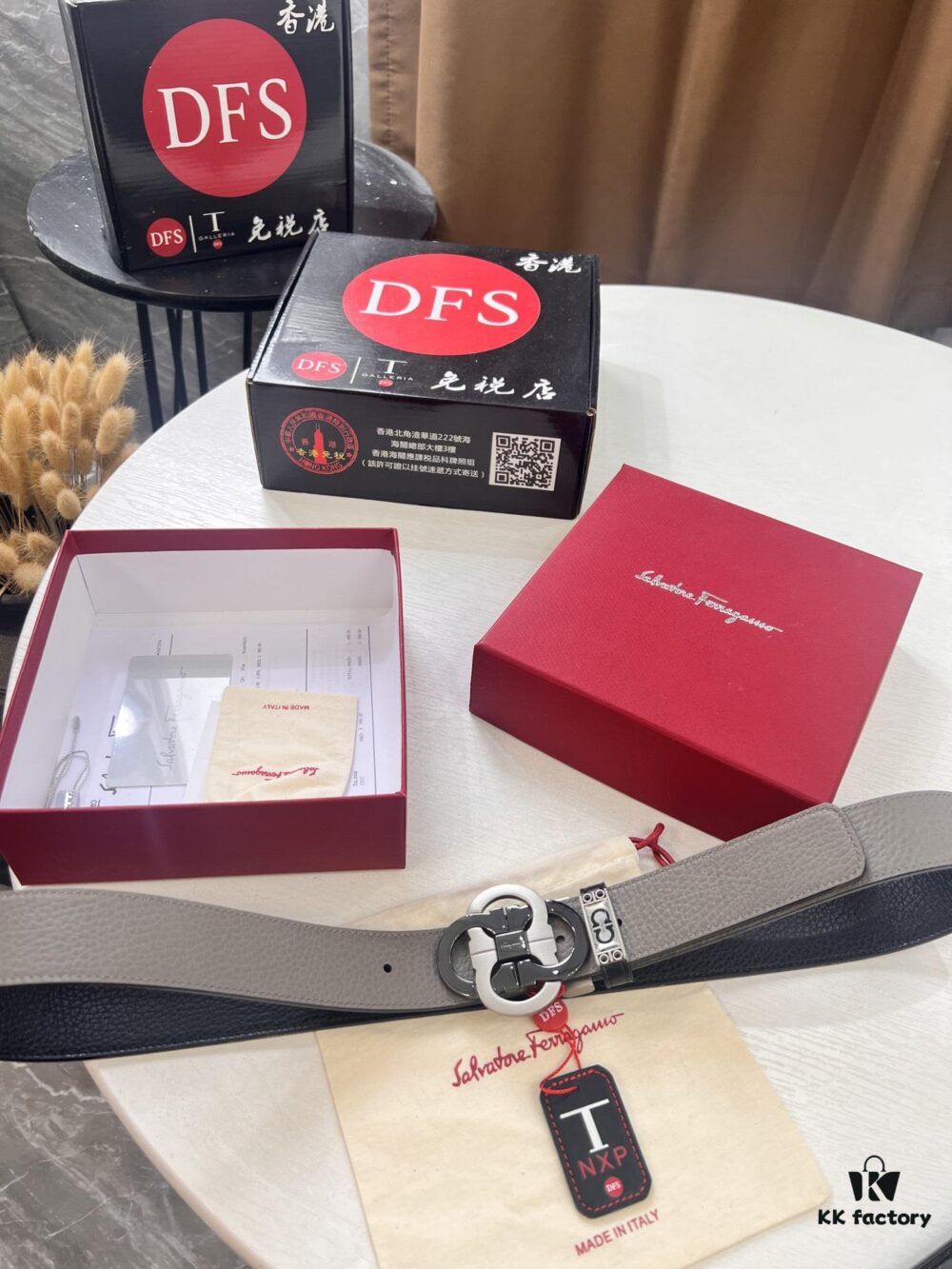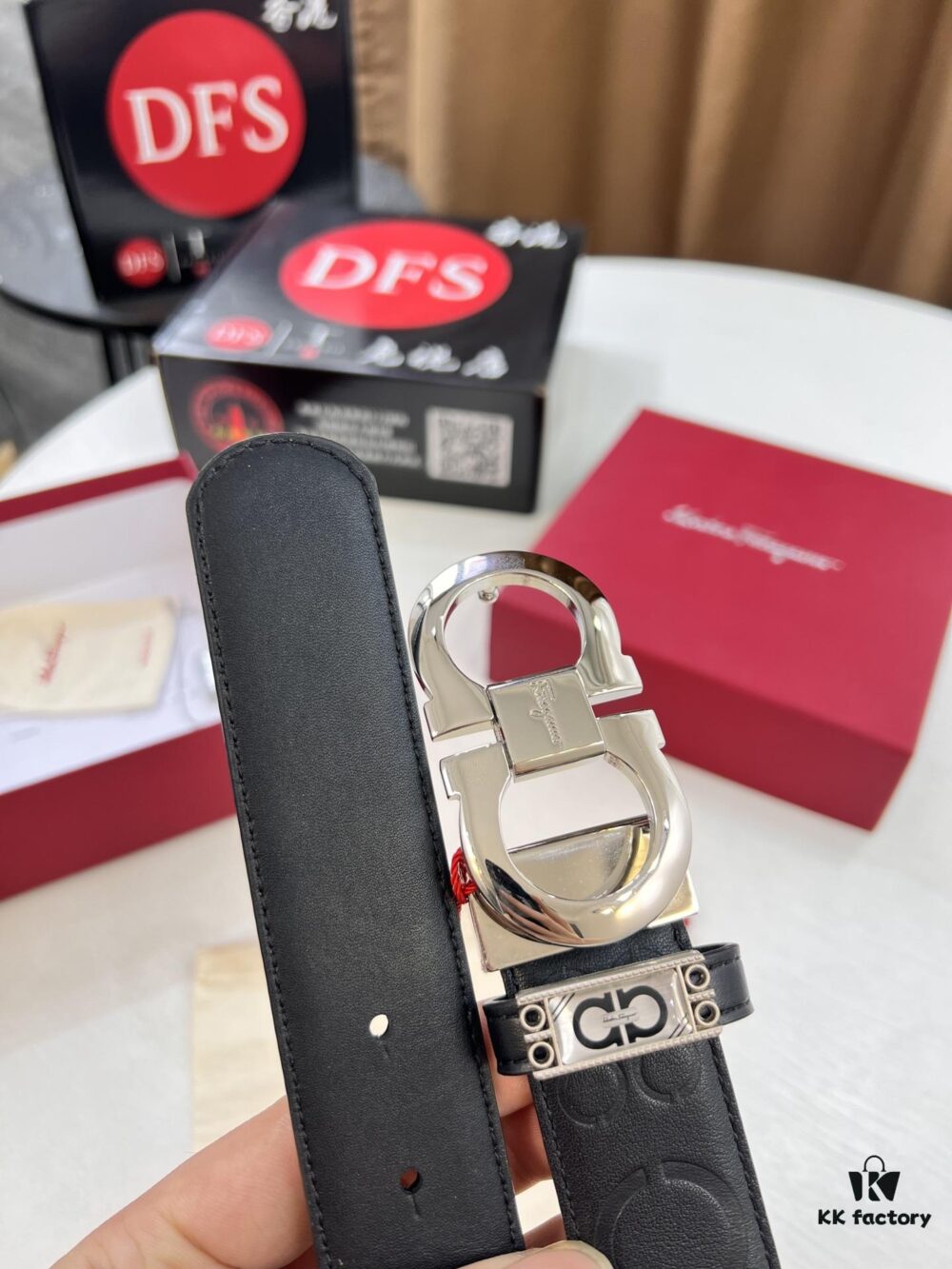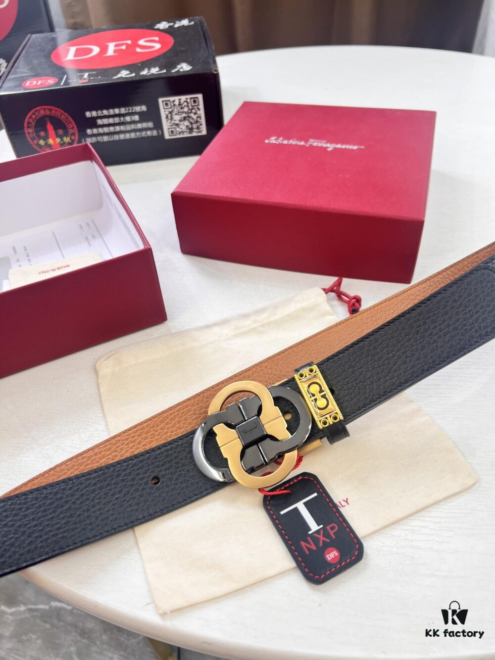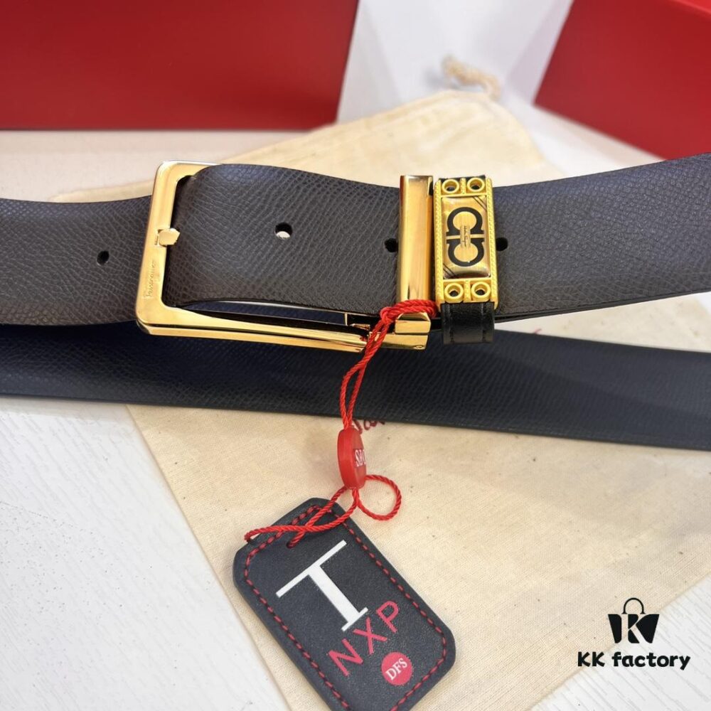 Ferragamo Men’s Belt, Genuine First-Layer Calfskin with Double-Sided Usage, 3.5cm Width, Stainless Steel Buckle, Adjustable Length