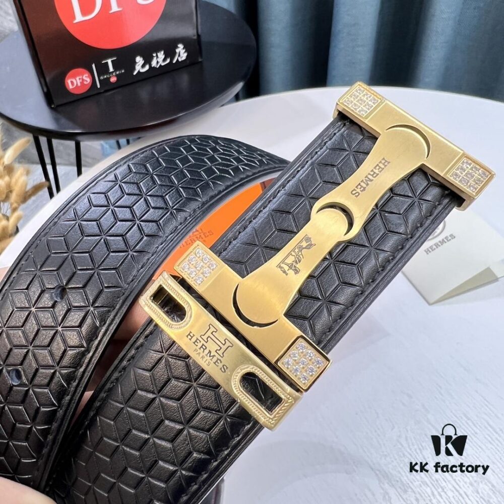 Hermès Men’s Belt – Genuine Top-Layer Calfskin with Diamond-Paved Letters, Stainless Steel Hardware, 3.8cm Width