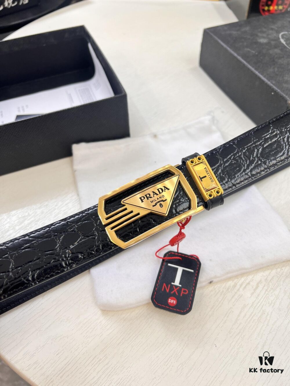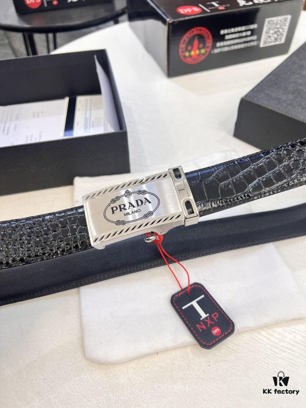 Prada Automatic Buckle Belt, Premium Calfskin with Crocodile Texture, 3.5 cm Width, Top-Quality Business Leather Belt