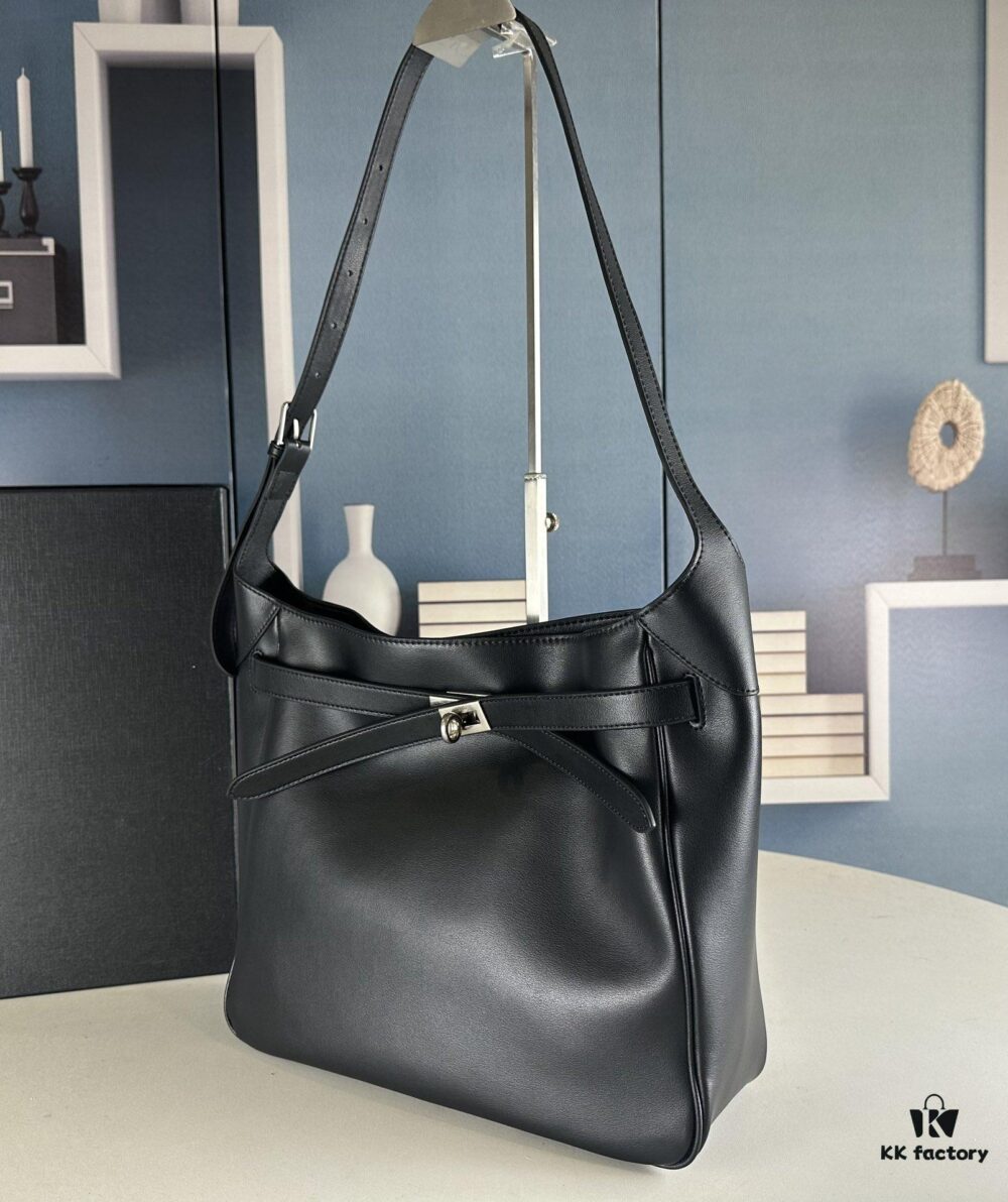 New BALENCIAGA Winter 24 Collection Re-See Shoulder Bucket Bag, Full-Grain Leather, Minimalist Luxury Design, Upcycled Motorbike Glove Handbag with Keychain Closure, Elegant and Sophisticated Lazy Lady Style
