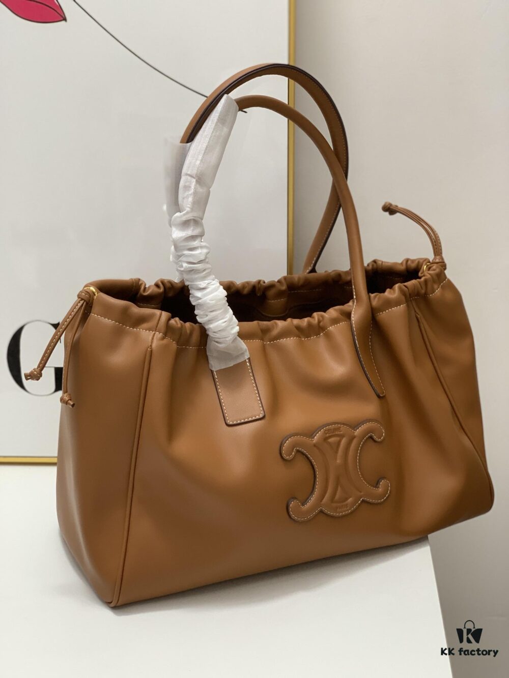 Celine New Arrival Tote Bag, Calfskin Material, Arc de Triomphe Embossed Logo, Drawstring Closure at Opening, Adjustable Size