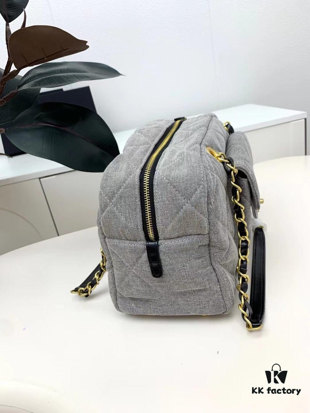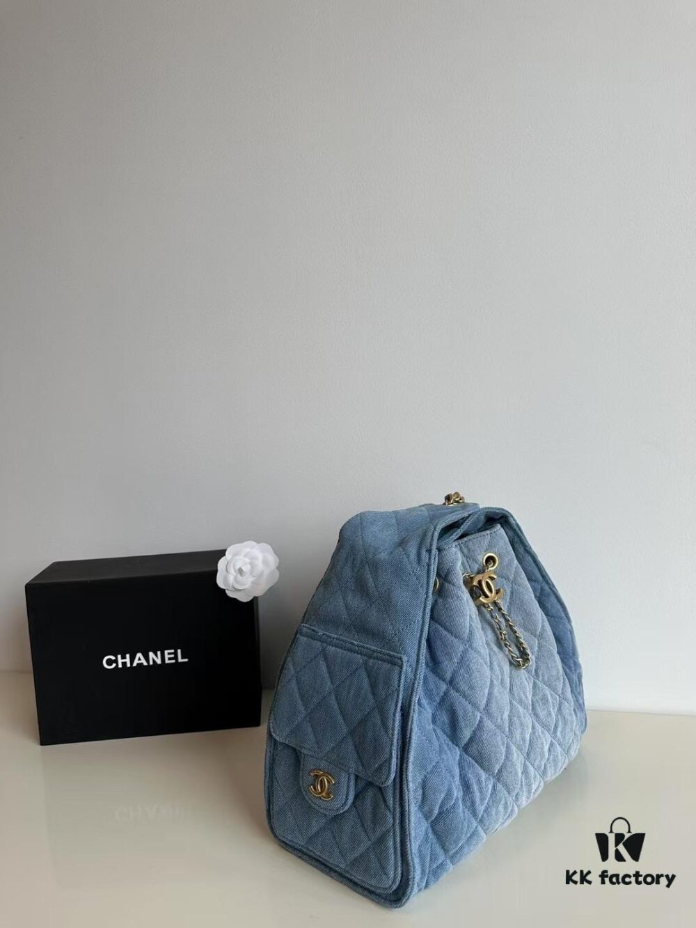 Chanel Washed Denim 25C Hobo Bag with Quilted Ball Texture, Vintage Coin Buckle Drawstring Bucket Bag in Retro Black and Gold with Diamond Stitching and Classic Chain Design