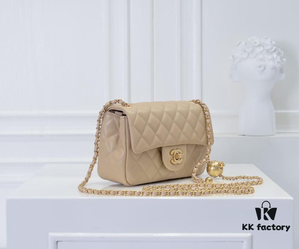 Large Beige Chanel CF Mini Metal Flap Bag – Bestseller with Decorative Gold Ball on Chain