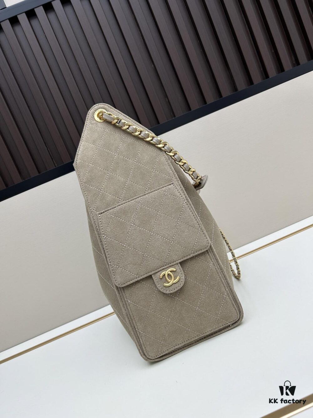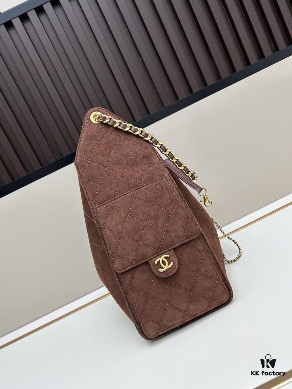 Large Size Suede, Frosted, Upgraded Chanel 25C Style Hobo Bag, Vintage Coin Button Drawstring Bucket Bag with Diamond Quilting and Retro Black-Gold Tone, Classic Chain Design