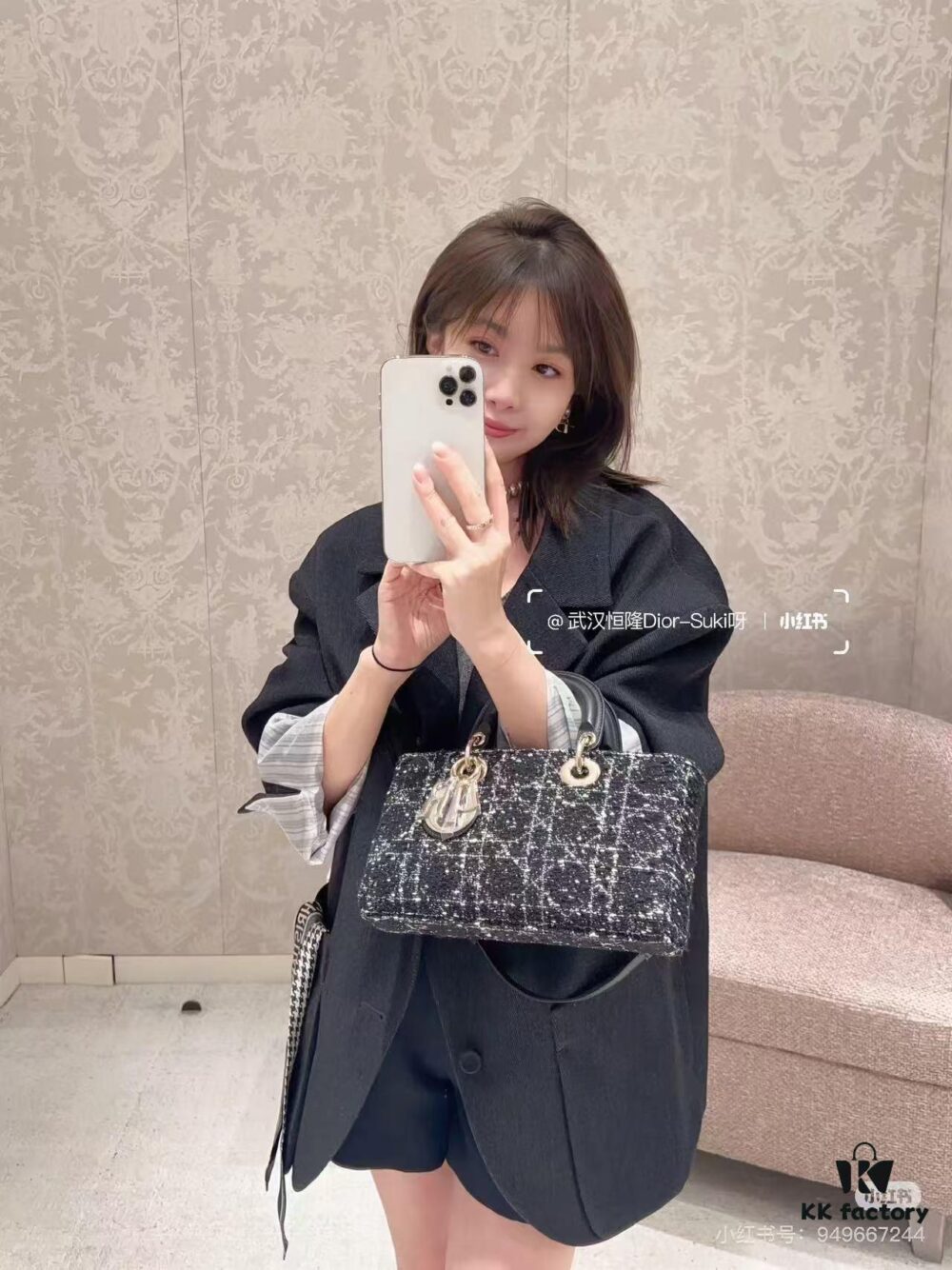 Ilady Dior Coarse Houndstooth Canvas and Leather Handbag with Adjustable Strap