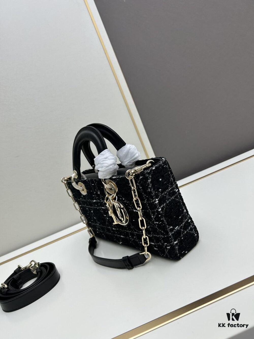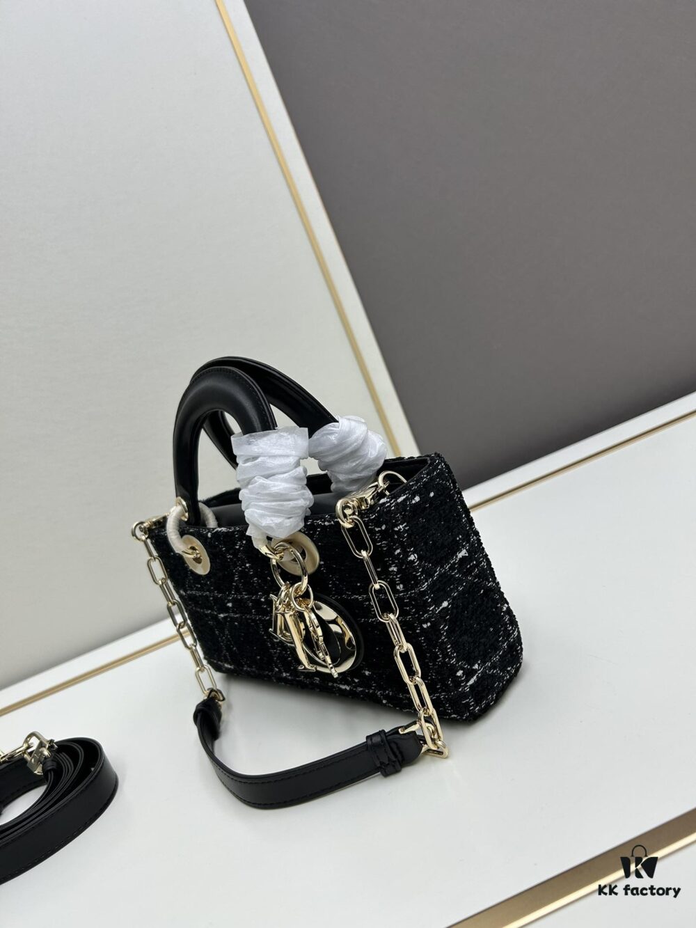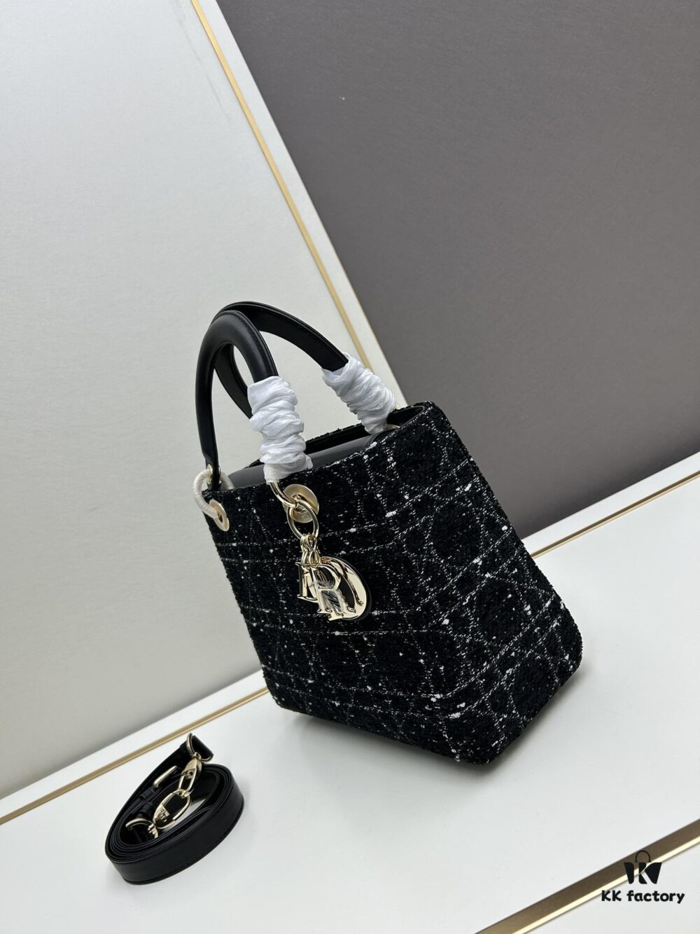 Ilady Dio.r Coarse Houndstooth Black Canvas and Leather Handbag with Adjustable Strap