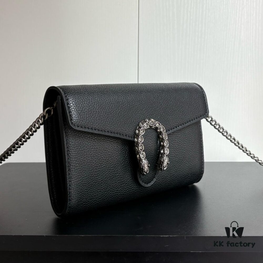 Real-shot #With Box – GG Dionysus WOC Chain Mini Handbag/Wallet in Black Full Leather with Horsehead Spur Closure and Flip Design