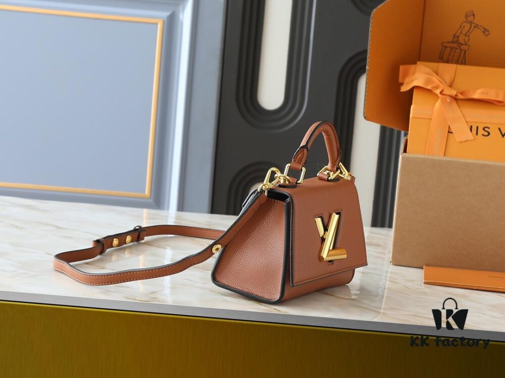 Upgraded Original M21590 M59090 Twist One Handle BB Handbag crafted from deeply dyed Taurillon leather, featuring a top single handle and the iconic LV Twist turn-lock flap closure. The contrast-color leather lining adds a trendy touch, ideal for crossbody, shoulder, or handheld wear.