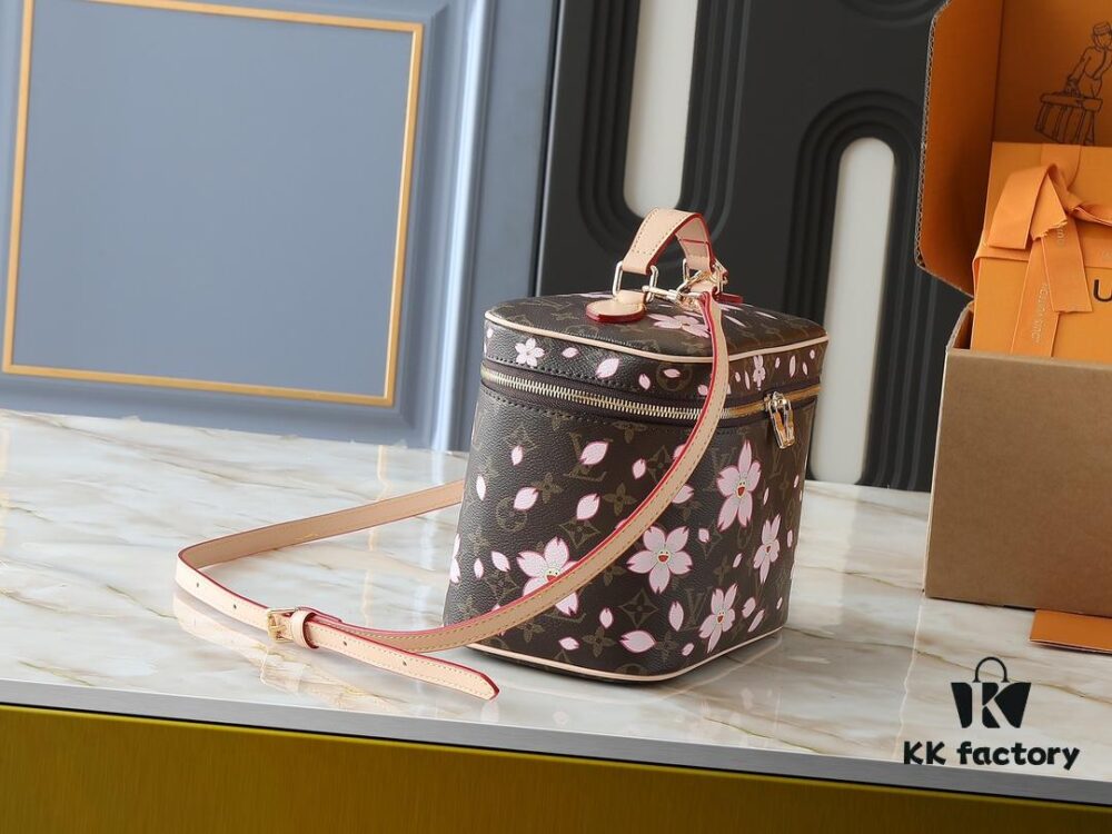 Upgraded Original M42265 M14181 M44495 M44936 M42263 Nice Cosmetic Pouch Made of Monogram Coated Canvas with Rounded Silhouette Inspired by Trunk Design, Cherry Blossom Pattern Exudes the Joyful Spirit of Louis Vuitton x Takashi Murakami Reimagined Collection, Cowhide Leather Handle Highlights Exquisite Craftsmanship, Double Zipper Closure Securely Stores Daily Essentials