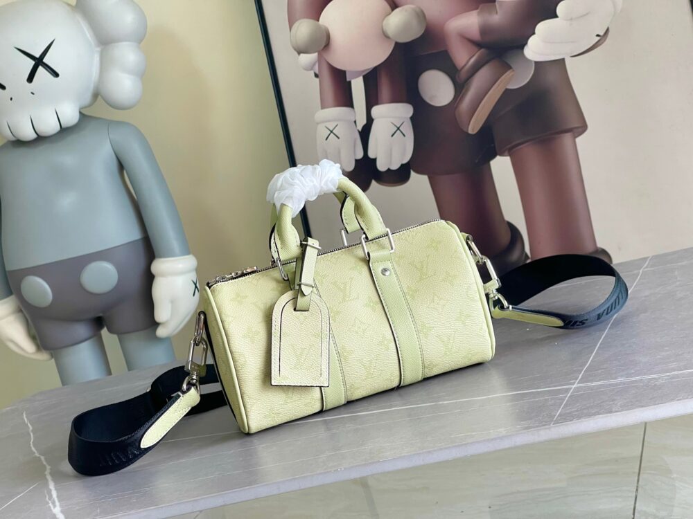 Louis Vuitton M14078 Light Khaki Green Pillow Bag. This Keepall 25 handbag is made of Monogram Eclipse Reverse canvas.