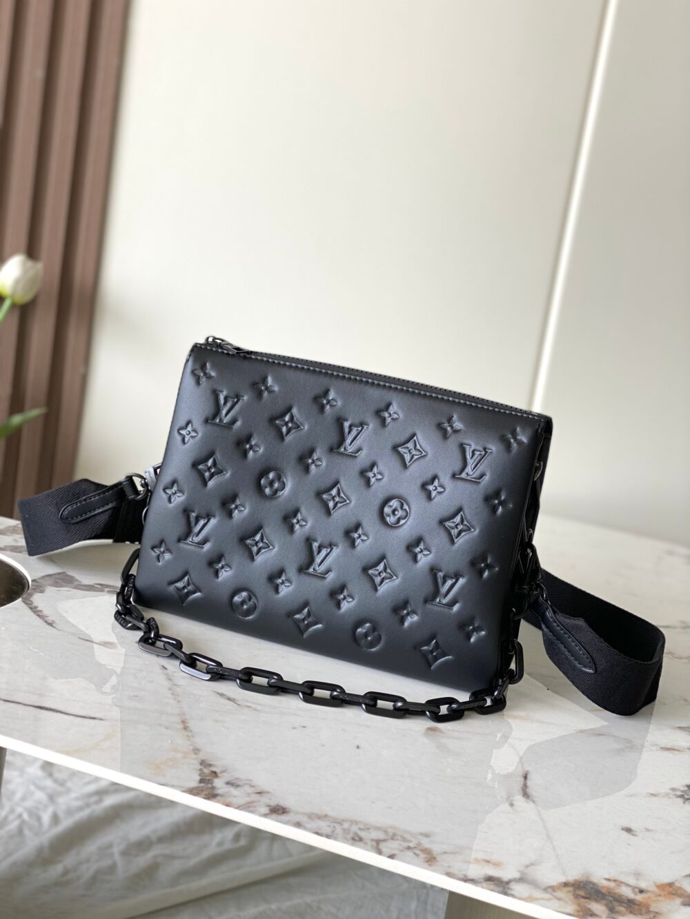 Louis Vuitton M11370 Black embossed leather bag with black chain.