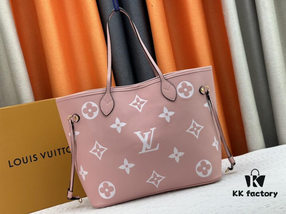 NEVERFULL MM Tote Bag M45684 M45685 M40995 (Embossed) Monogram Montana Leather Handbag in Pink with Cream Stripes