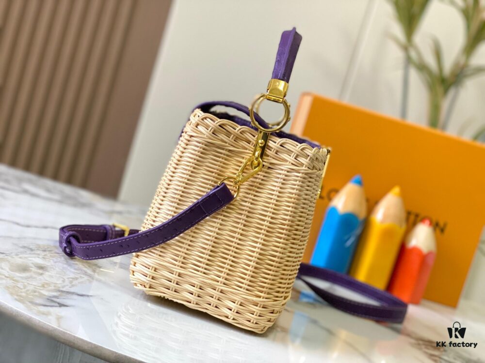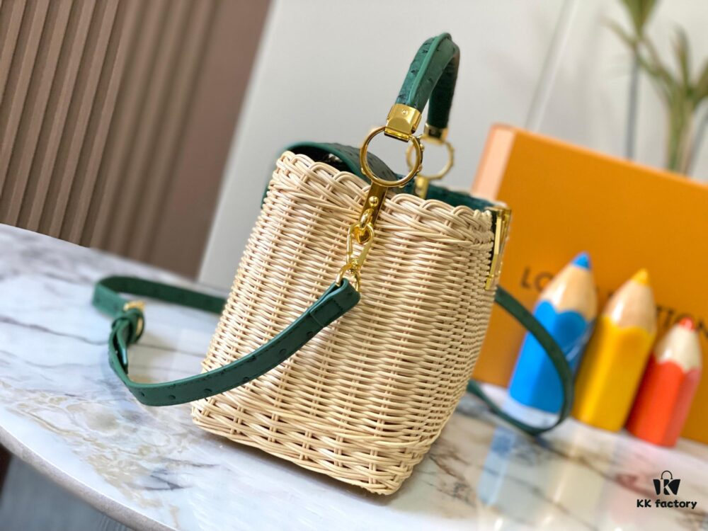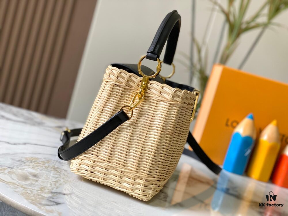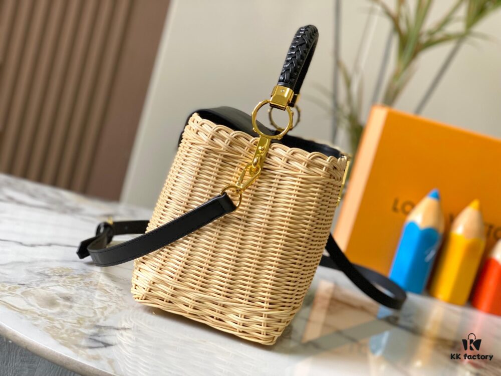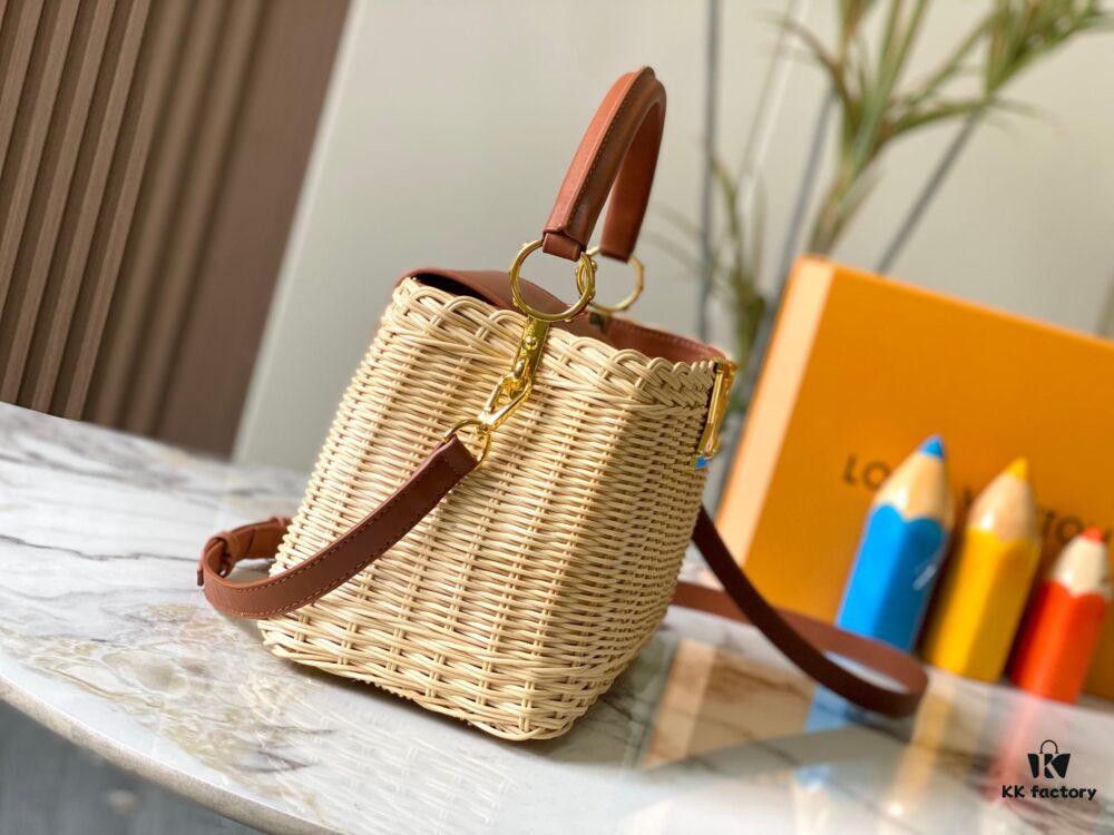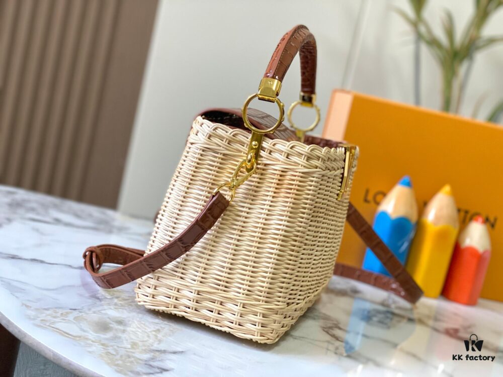Upgraded M11617 Capucines BB Handbag featuring a woven rattan design inspired by the 1892 Louis Vuitton picnic trunk