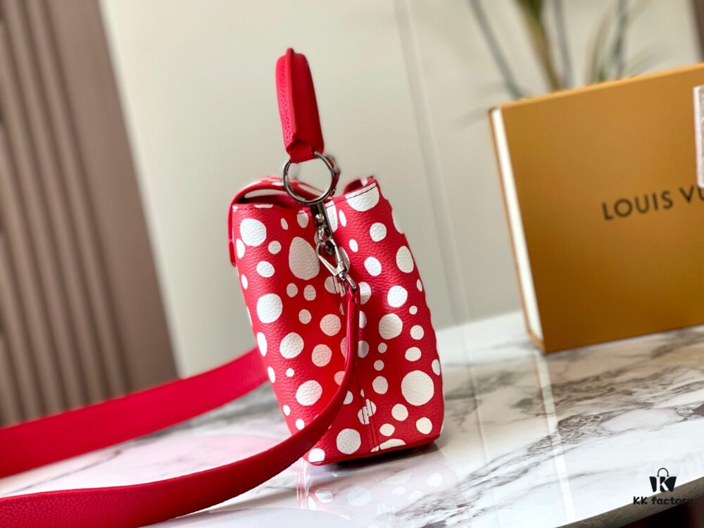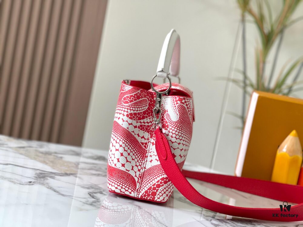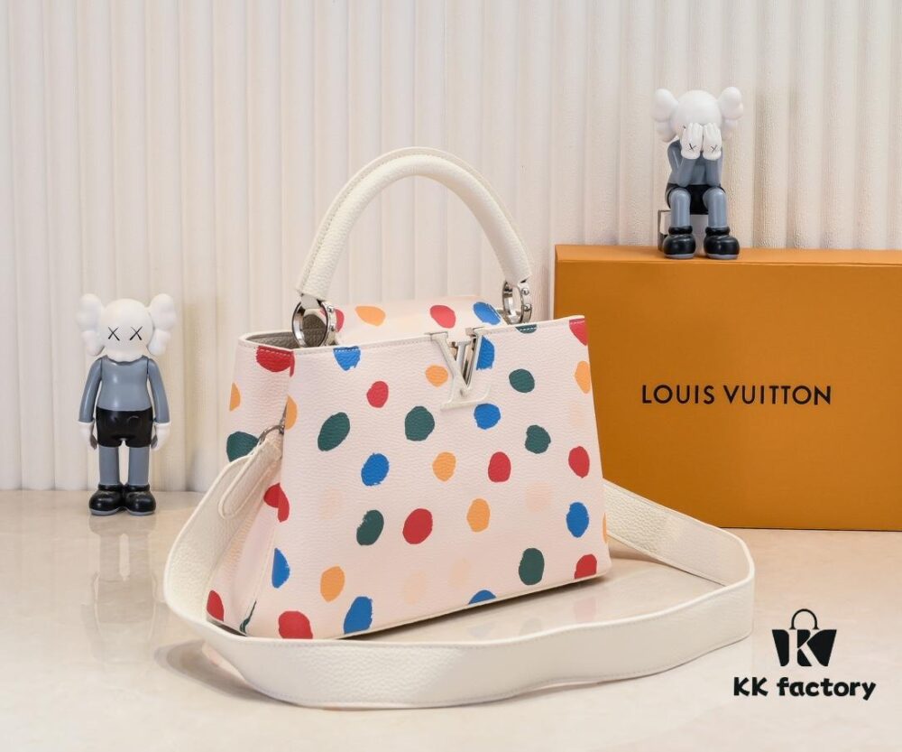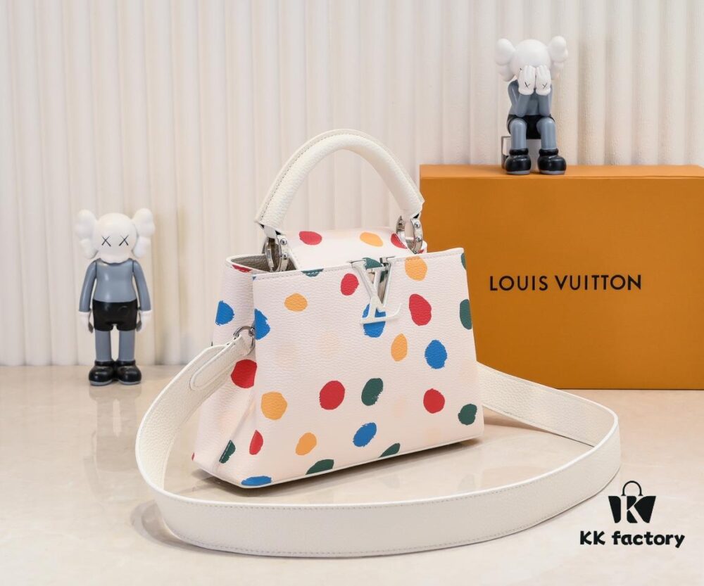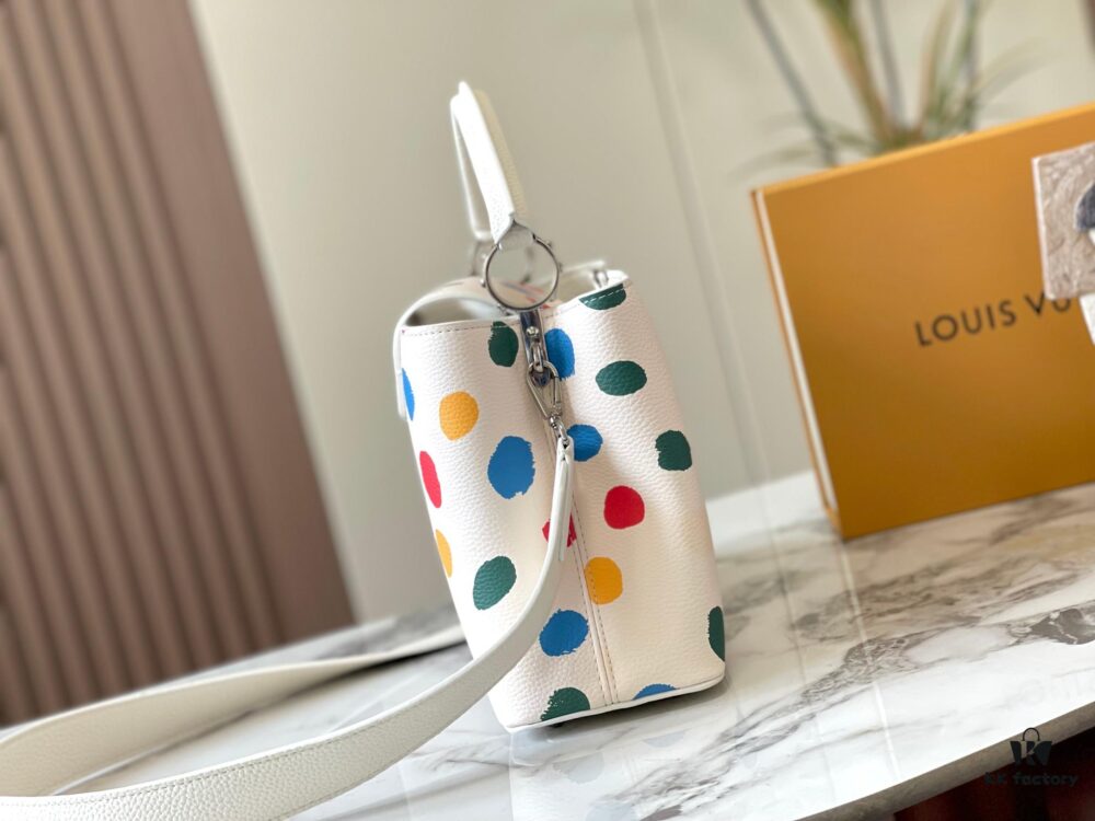 Upgraded M21663 This LV x YK Capucines Small Handbag is from the Louis Vuitton x Yayoi Kusama collaboration collection. The renowned Japanese artist, captivated by polka dots since childhood and viewing them as a symbol of infinity, vividly expresses this motif through 3D hand-painted polka dot prints on supple Taurillon leather.