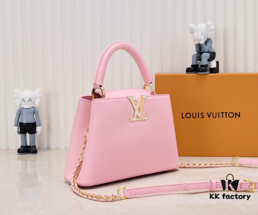 Upgraded M59868 Stellar Pearlized Powder with Mother-of-Pearl Button – This Capucines BB Bag Features Taurillon Leather That Shimmers in Changing Hues Under Different Lights