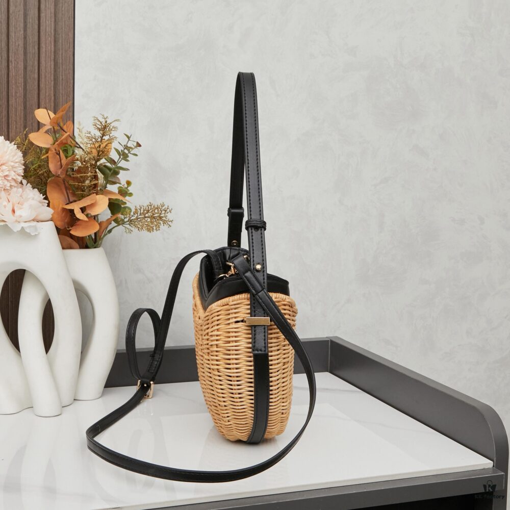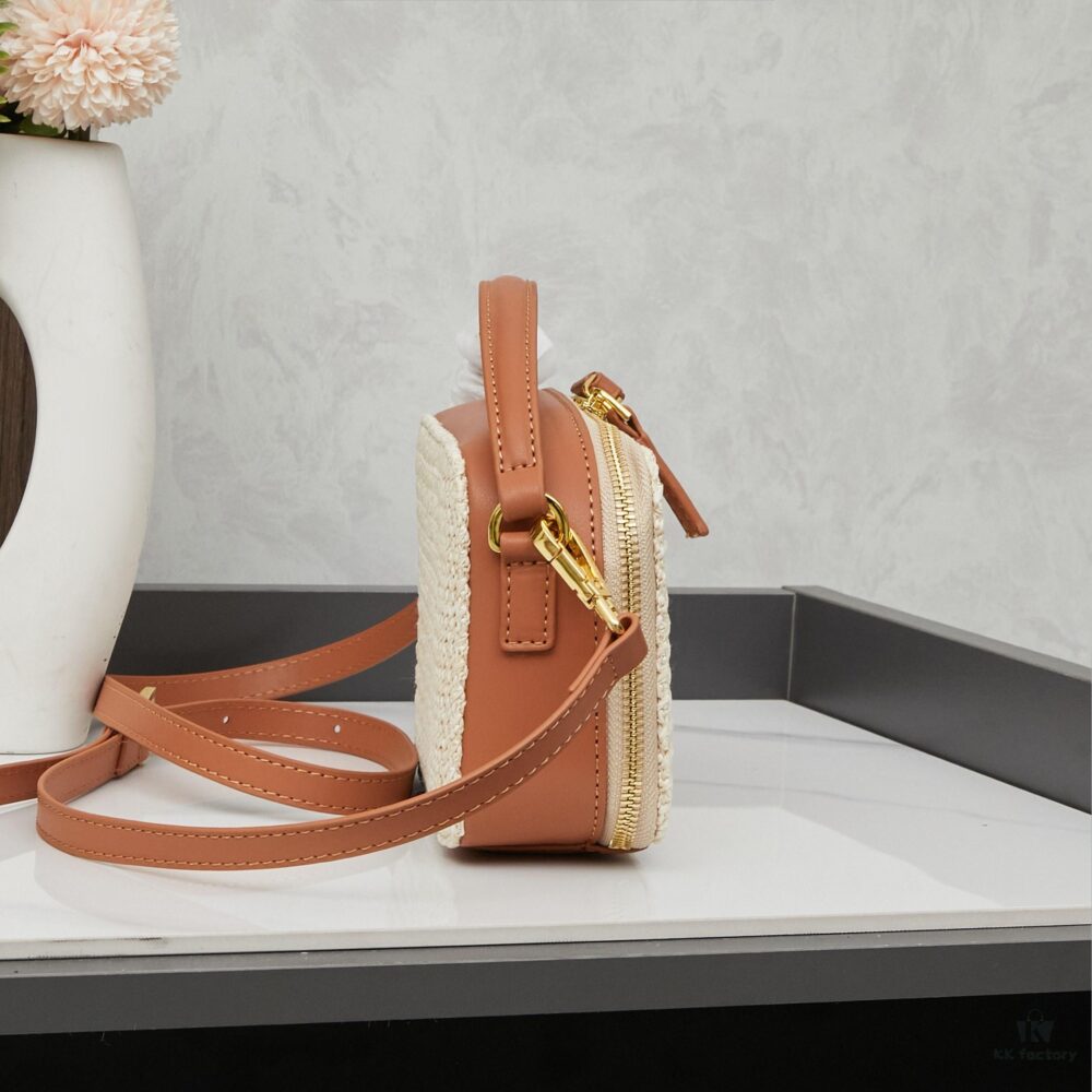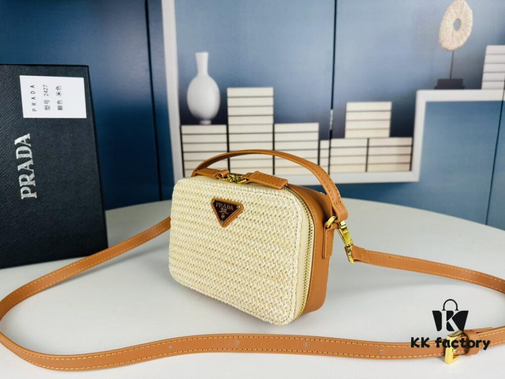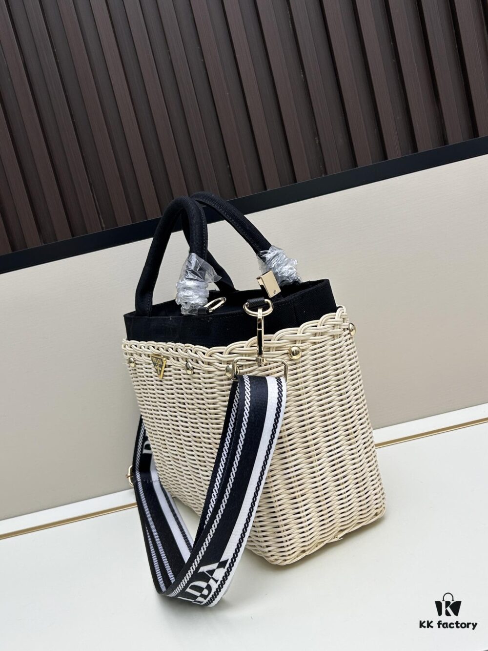 Prada-Inspired Wicker Basket Bag – Stylish Vacation Essential, Handwoven with Palm Leaf and Genuine Leather, Top-Quality Hardware, Classic Logo Design