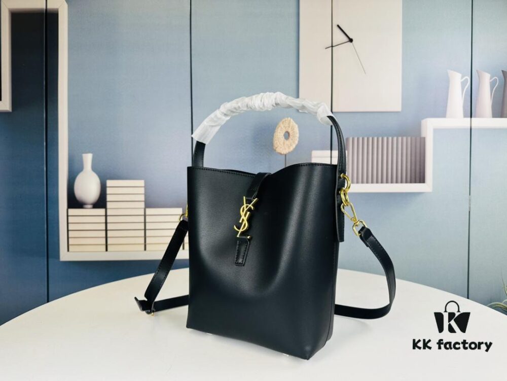 New Arrival with Box! Authentic YSL LE37 Bucket Bag, Celeb-Style Shiny Leather Black-Gold Edition