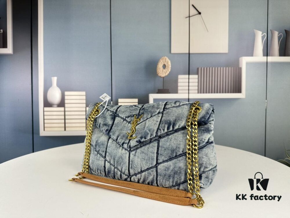 New Large Denim YSL Puffer Bag with Box Loulou Puffer Cloud Bag Washed Denim with Beige Suede Strap