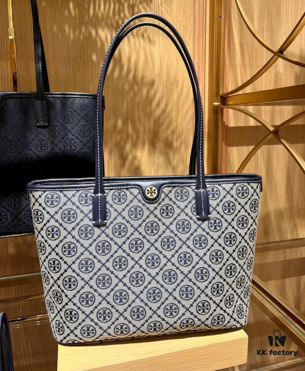 Tory Burch Small Monogram Tote Bag with Signature Double-T Logo in Woven Jacquard Fabric