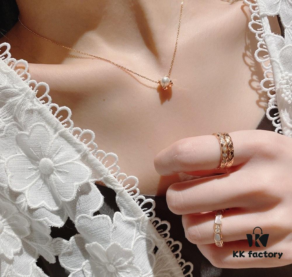 Cartier Love Pearl Necklace and Stud Earrings, Chanel Coco Crush Mini Narrow Ring, BV Snake Bone Mother-of-Pearl Diamond Ring