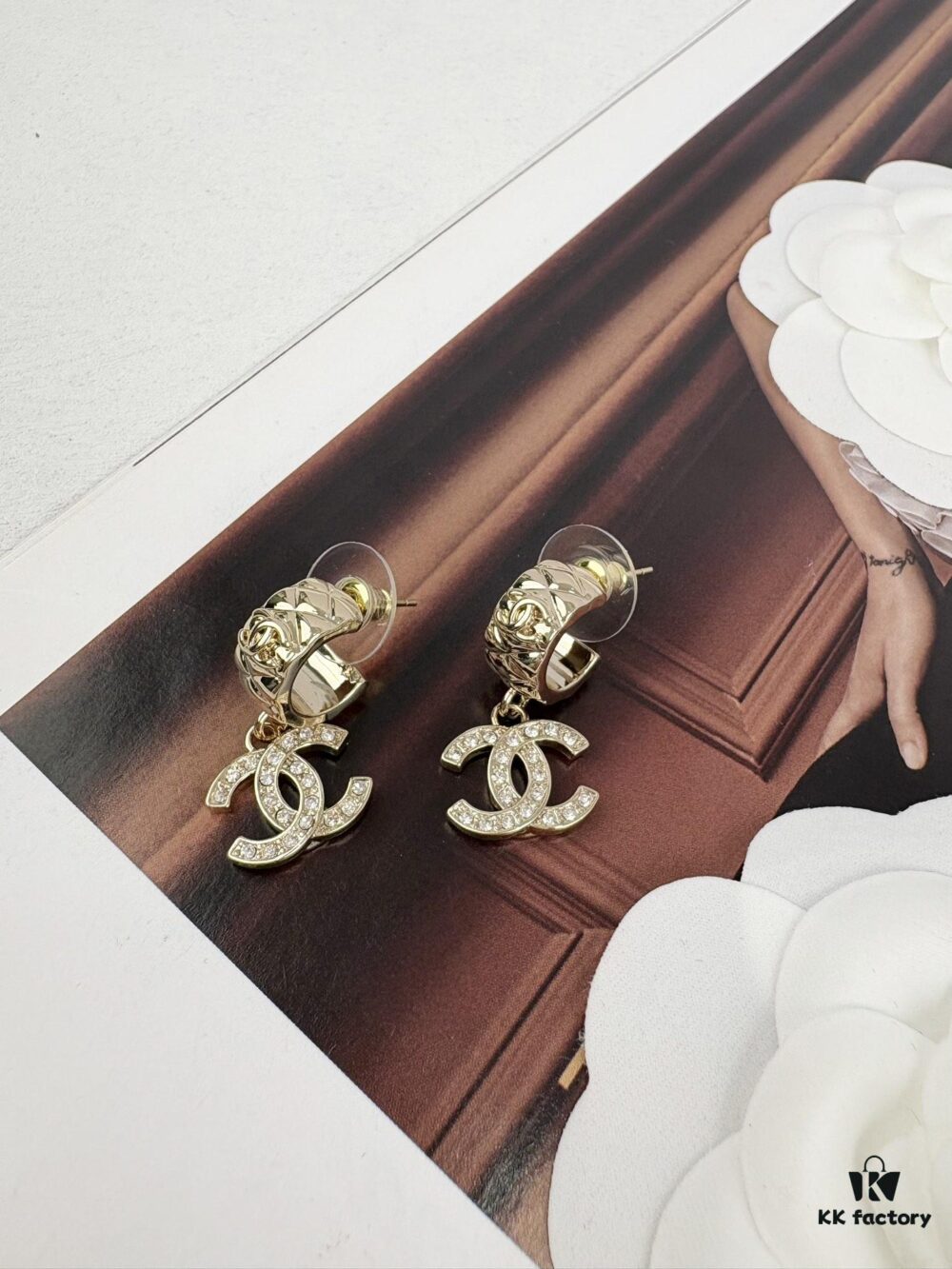 Xiaoxiang New Arrival Light Gold Diamond-Patterned Elegant Double C Earrings with Full Rhinestones, Hook Style