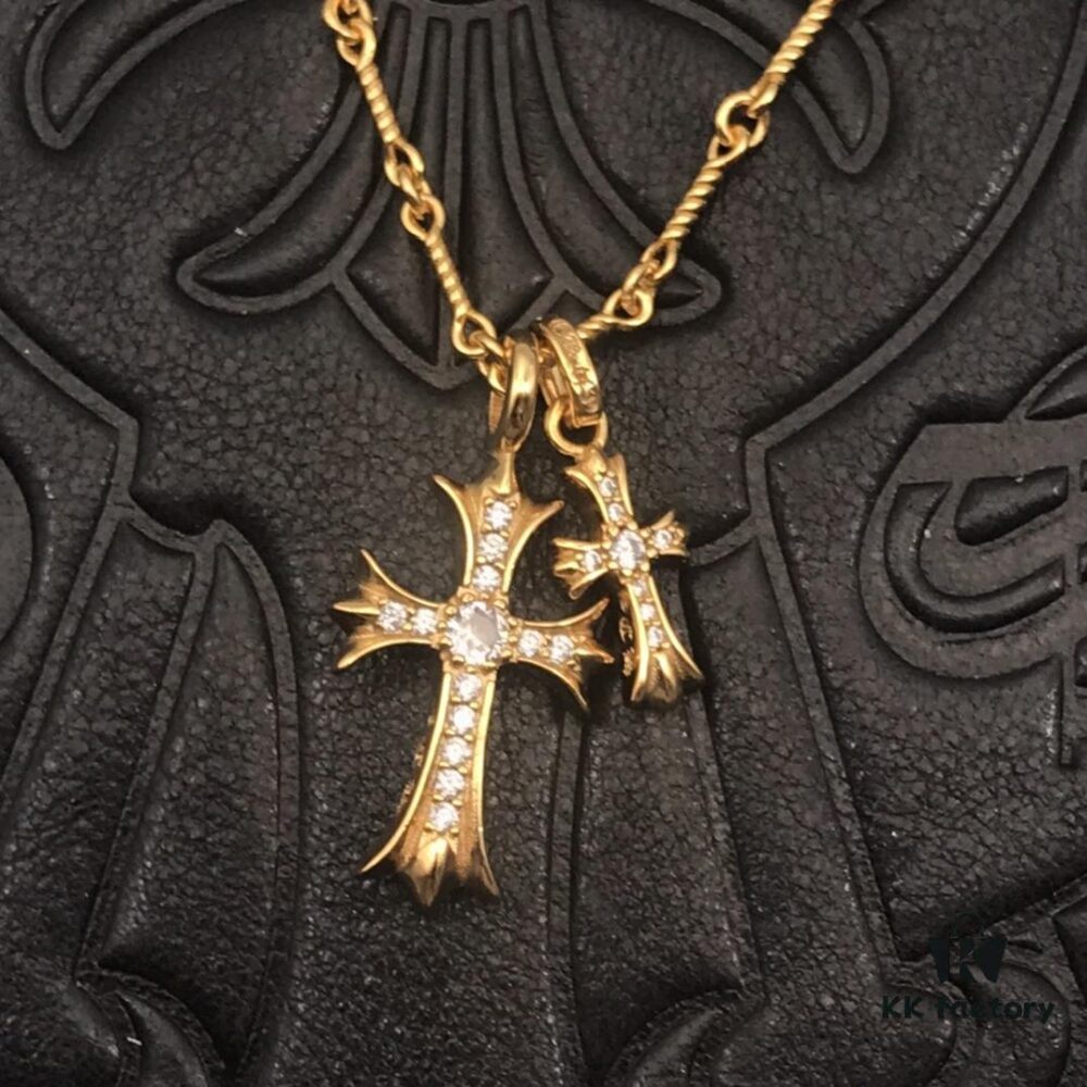 High-Version Chrome Hearts White Diamond Double Cross Necklace, Thick 22K Gold Plated, 50-70cm Adjustable Chain