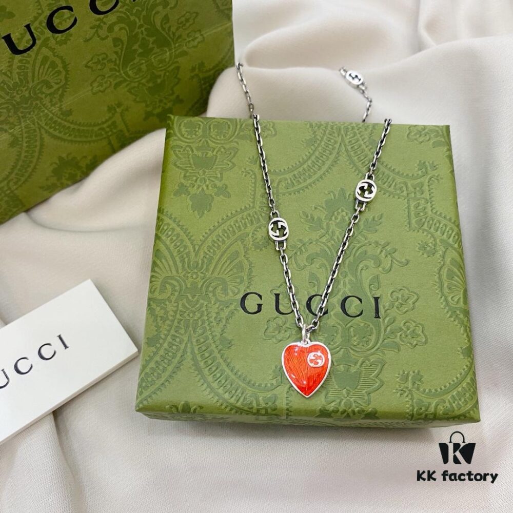 Gucci Gucci 925 Sterling Silver Interlocking Double G Enamel Red Heart Pendant Necklace