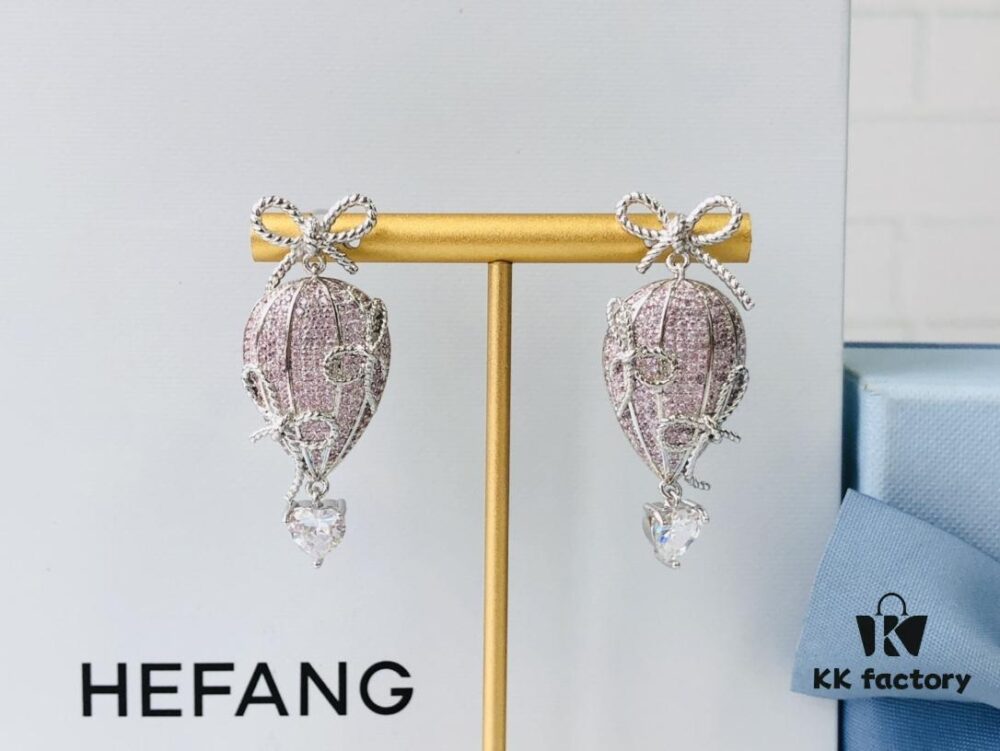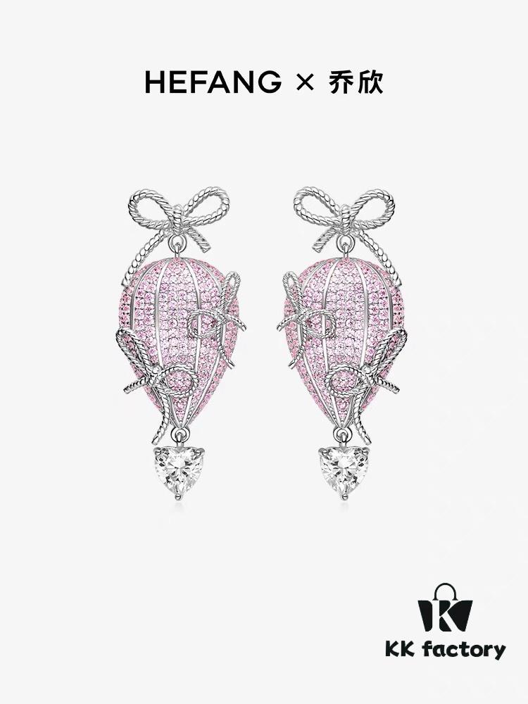 HEFANG Jewelry – Love Balloon Pink Heart Full Diamond Stud Earrings, High-Grade Sterling Silver with Logo