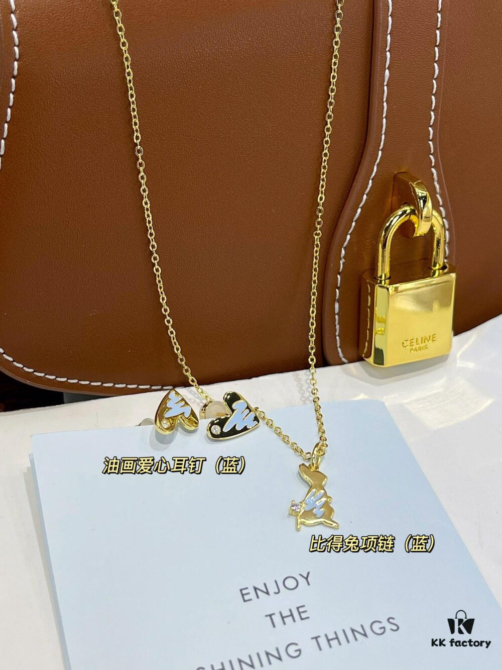 Asymmetric Heart Oil Painting Stud Earrings and Peter Rabbit Pendant Necklace