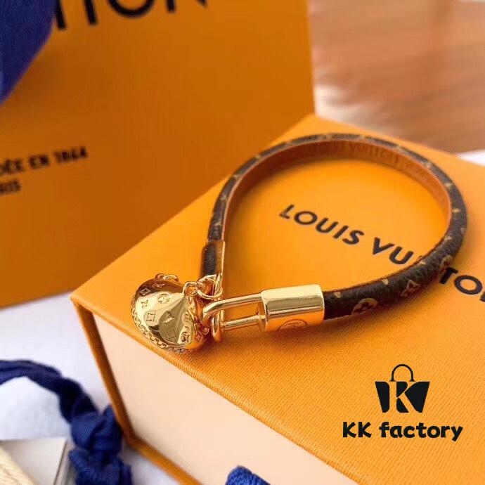 LV Latest Pure LV Double-Circle Metal-Combined Monogram Leather Bracelet for Women
