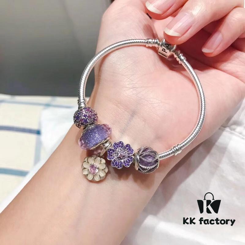 Pandora Pandora Silver Wire Purple Flower New Arrival! Highest Quality Available, Compatible with Official Counter Cleaning! Made with Cabinet Materials, Perfect 1:1 Craftsmanship! Imported Original Purple Glass from Thailand 🇹🇭, Sparkling Diamond Beads, Shiny Full-Paved Purple Five-Petal Flower, Purple Lace-Covered Ball Pendant. S925 Silver Comes with Official Packaging!