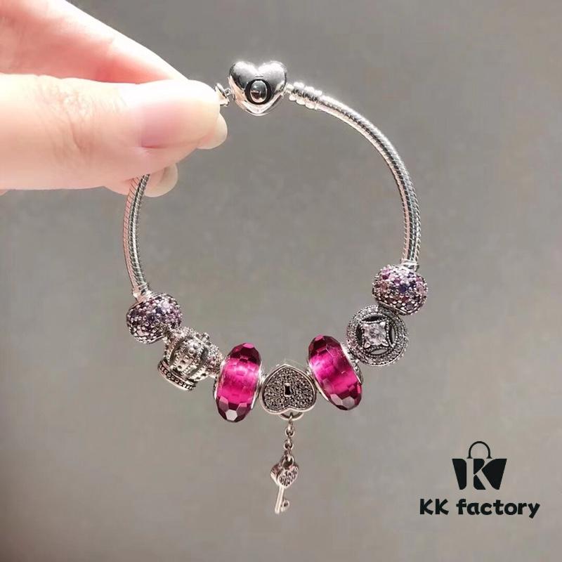 Pandora Rose Red Sparkling Crystal Heart Key Pendant! New Arrival! Made with Cabinet Materials, Perfect 1:1 Craftsmanship, Quality Comparable to Official Counter! Rose red faceted glass, lucky sparkling beads, openwork crown, pink-purple sparkling beads, heart-shaped key charm, S925 silver, comes with official packaging!