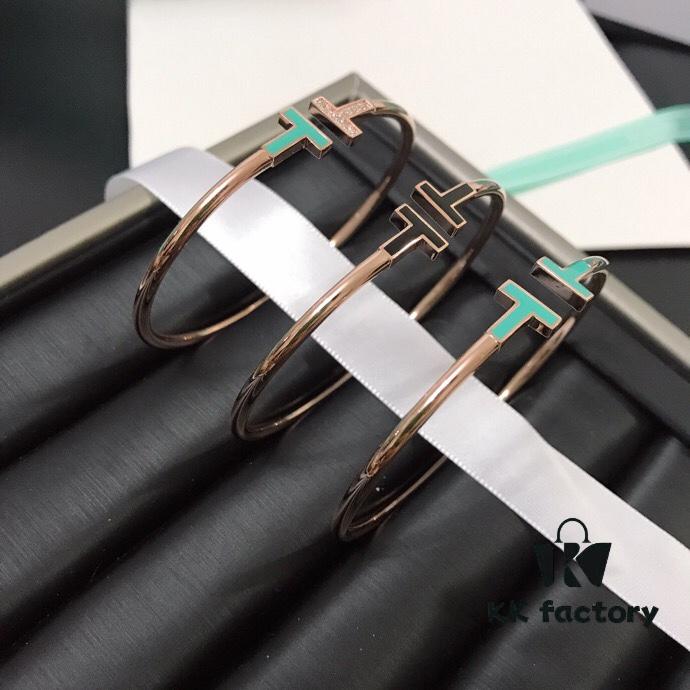Tiffany & Co. New Double T Enamel Bracelet in 925 Sterling Silver with 18K Rose Gold Plating, New Color Combination and Sparkling Zirconia