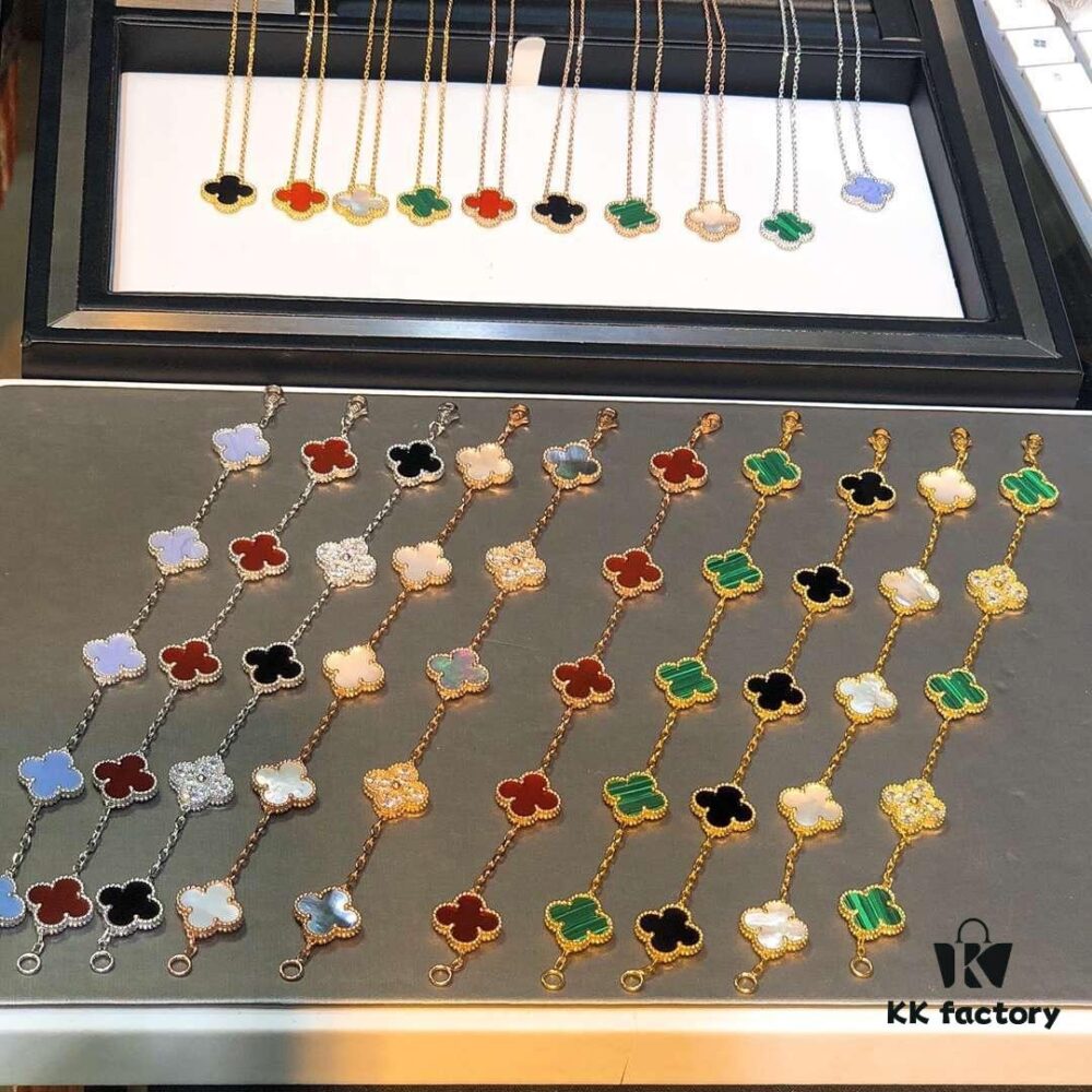 Van Cleef & Arpels VCA Four-Leaf Clover Five-Petal Bracelet, Highest Quality, Authentic Purchased Level! 925 Silver Plated with 18K Gold, Genuine Vacuum-Plated 18K Gold, Natural Mother-of-Pearl Inlay, Seamless Setting, Rhombus Clasp, Chain Length 16+1.5+1.5cm, Black Onyx, Red Agate, White Mother-of-Pearl, Complete K-Gold Style Packaging