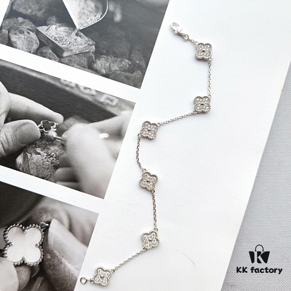 Mini Four-Leaf Clover Full Diamond Bracelet and Necklace in V-Gold and Silver, Single Flower and Six-Flower Designs Available