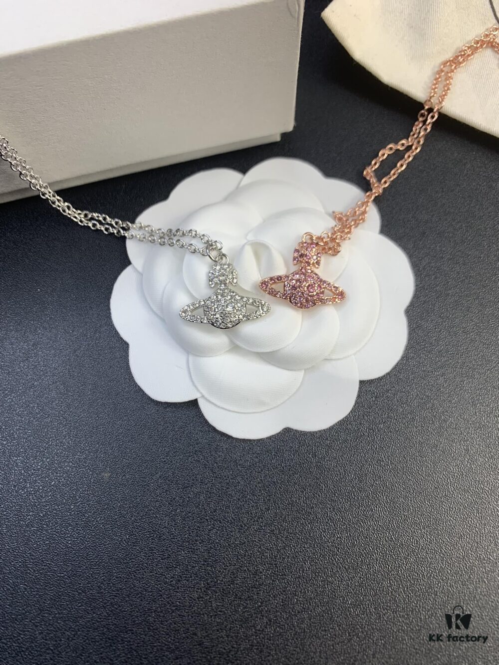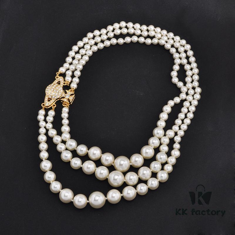 Vivienne Westwood Enamel Pearl Necklace with Magnetic Clasp, Double-Sided Wear, Saturn and Crown Design, Elegant and Edgy Style