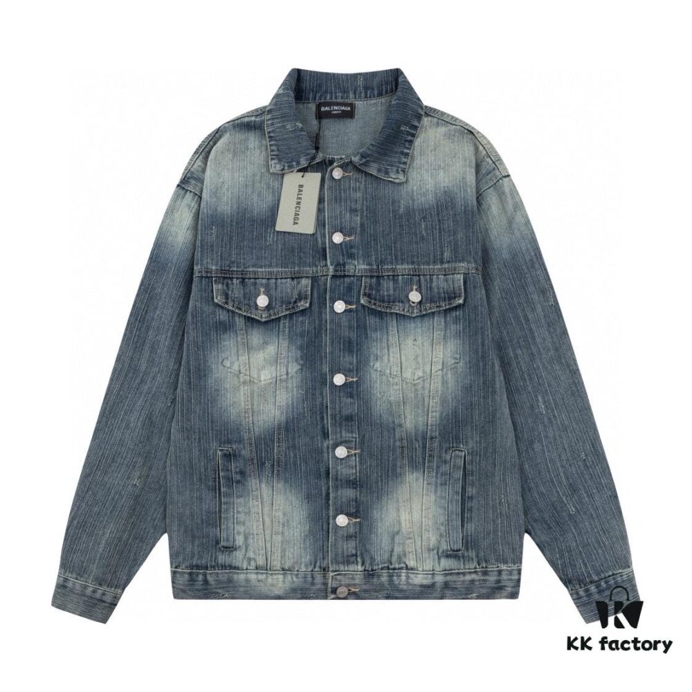 New Balenciaga-style Washed Vintage Denim Jacket with Back Rhinestone Lettering BLCG