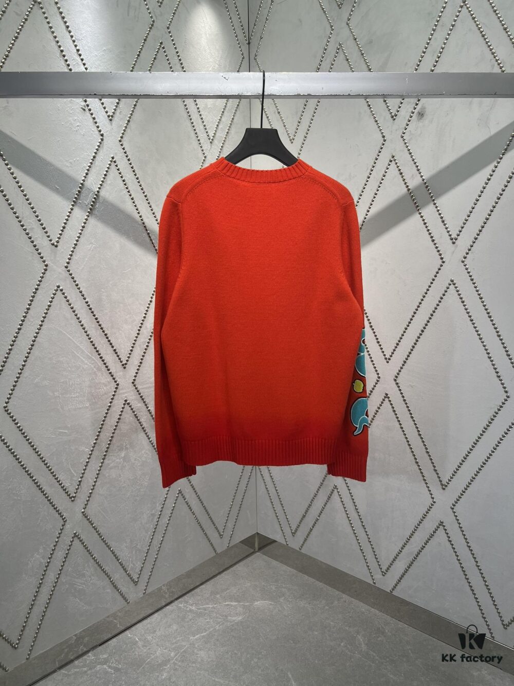DIOR 25SS New Arrival Knitwear from the DIOR AND KAWS Limited Collection. Crafted from red and burgundy wool knit fabric, one sleeve features the DIOR AND KAWS signature embroidery, reinterpreting the Dior logo with a vibrant serpentine motif. The hem and cuffs feature contrasting details, perfect for pairing with classic jeans or shorts to create a striking look.