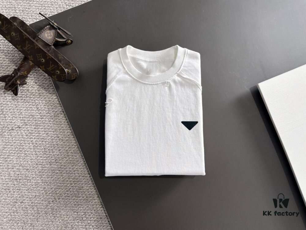 PRADA 2025 Spring/Summer New Arrival Round Neck Short Sleeve T-Shirt with Triangular Logo Patch on Chest and Side Stitch Pocket, Made of High Grammage 320g Double-Yarn Combed Cotton Fabric, Slightly Loose Fit, Soft and Substantial Fabric Texture, Unisex Design