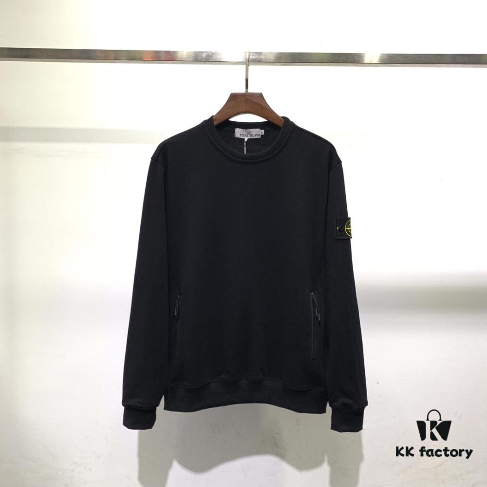 Stone Island Classic Arm Badge Zipper Pocket Terry Crewneck Sweatshirt in Black and Blue