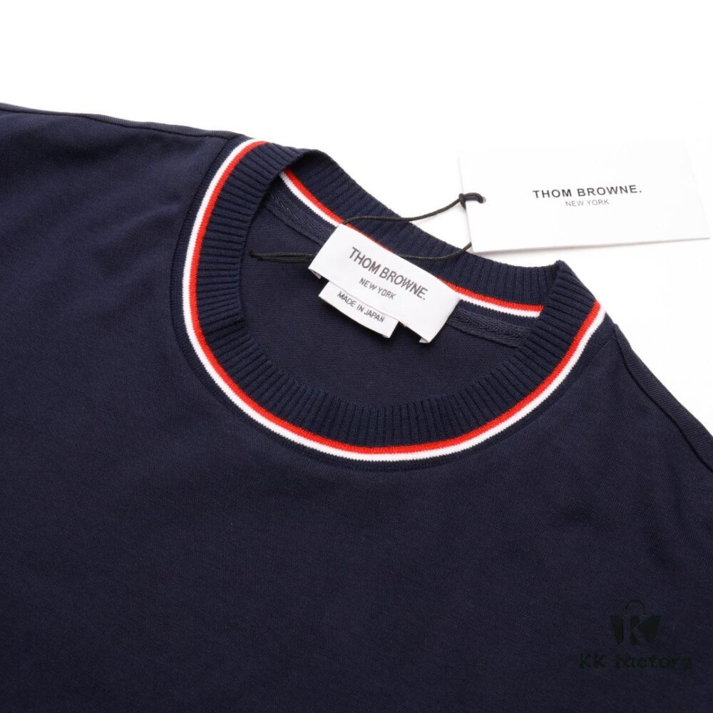 THOM BROWNE TB Red Stripe Woven Crew Neck Short Sleeve T-Shirt in Navy