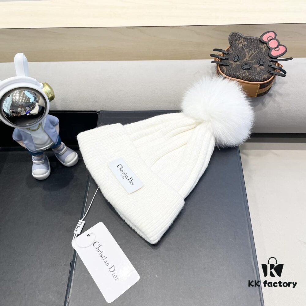 Dior Women’s Knitted Hat with Genuine Fox Fur Pom for Autumn and Winter, Thickened Warm Ear-Protecting Beanie