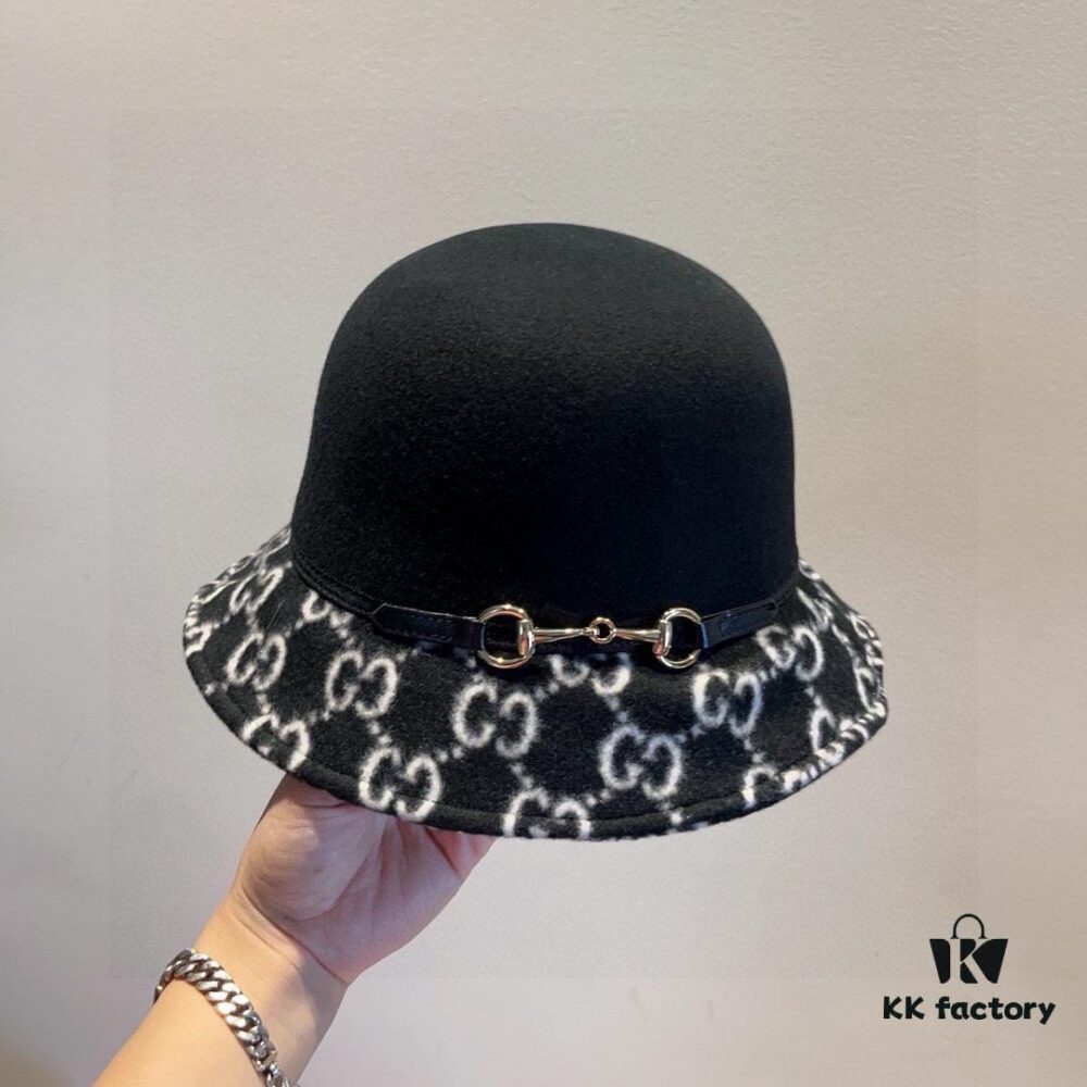 Gucci 2022 Fall/Winter New Wool Fedora Hat, GG Wool Hat with Horsebit Decoration, 57cm Head Circumference, Stylish and Versatile, Black and Khaki Colors, Elegant Ladylike Style